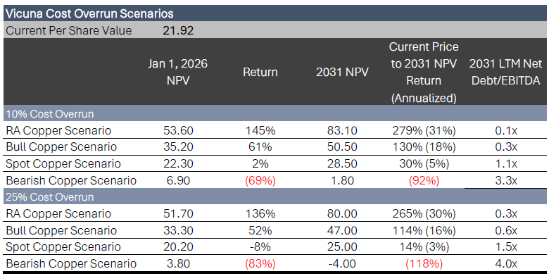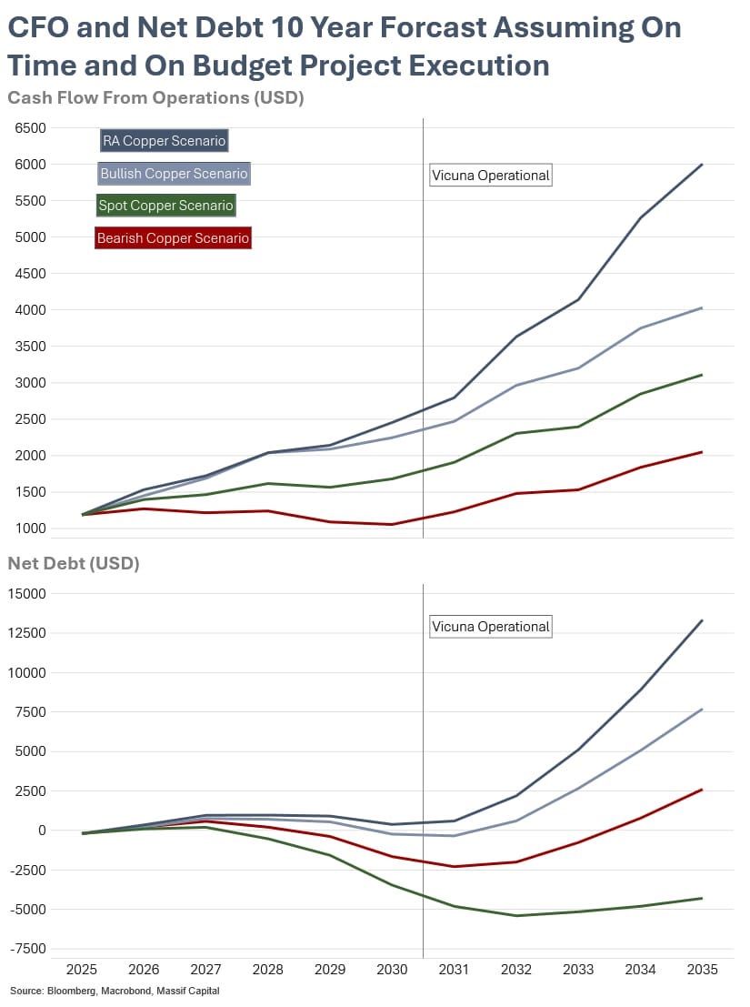 These projects are characterized by their relatively low capital intensity and proximity to existing infrastructure, reducing execution risk while providing meaningful production growth that translates into immediate cash flow. The importance of the additional cash flow from these seemingly minor projects and operational improvements makes a meaningful difference to the balance sheet in any copper scenario, as additional debt worth between 3.9% to 5.9% of the current market cap is necessary to maintain a balance sheet with $250 million in cash in the absence of these projects. The additional debt necessary to build Vicuna in the absence of the growth projects represents anywhere from 112% to 170% of the capex cost of the growth projects over the next five years. The loss of these projects would negatively impact the firm, particularly as copper prices rise.