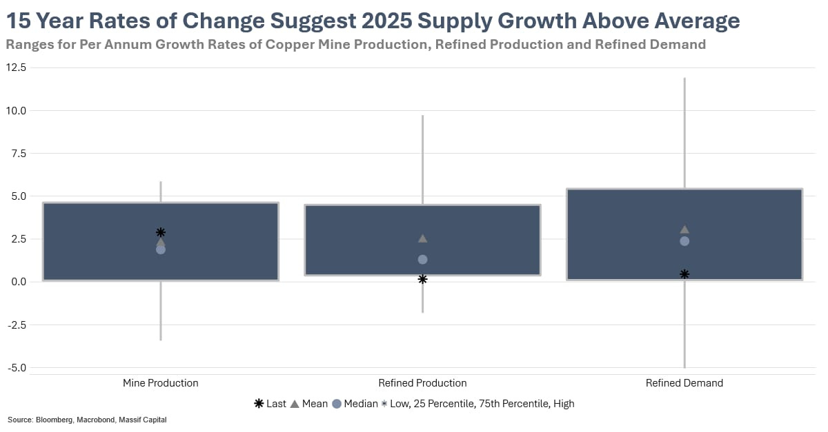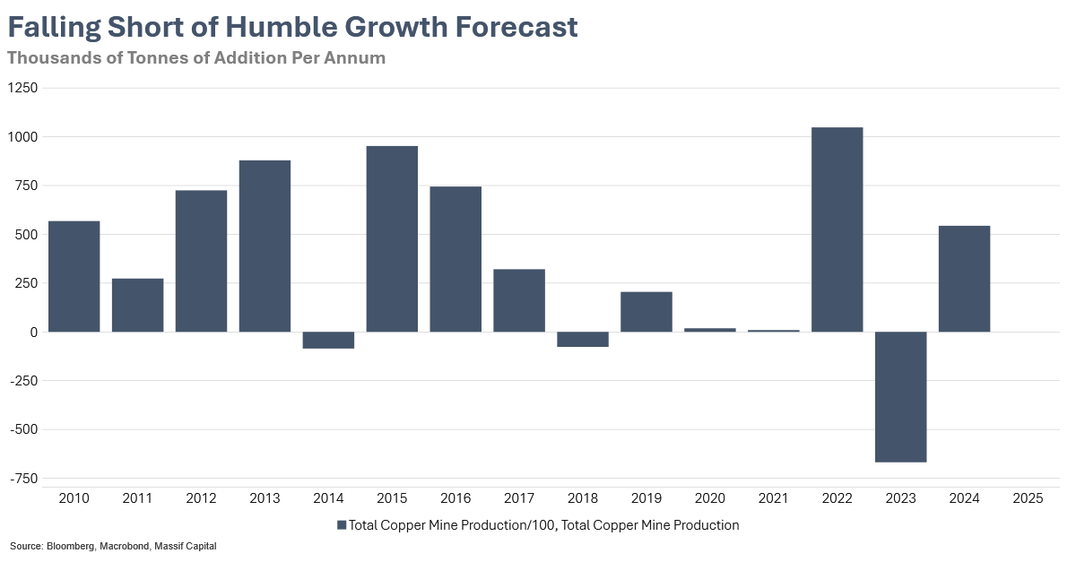 To make matters worse (or better, depending on how you want to think about it), MinEx Consulting reports that copper resources from discoveries since 2010 have grown at 7.5-15.5% CAGR, with additional resources being added to pre- 2010 discoveries. This means that the industry is discovering copper at a rate exceeding demand growth. The slow development of supply is not a function of variables outside our control, but rather a function of economic and political will. The copper is there; we need to incentivize/choose to build the mines. The industry fails to convert resources into production at a sufficient rate. The disconnect between resource availability and production capacity highlights structural bottlenecks in permitting, financing, and development that constrain supply growth regardless of geological potential.