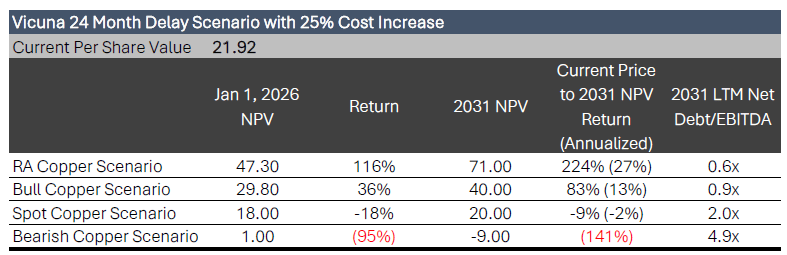 The high prevalence of mega projects that end up running behind schedule is sufficient that no review of LUN would be complete without testing the resilience of the valuation within the context of delays. In addition to the delays, we are also adding a 25% increase in the cost of Vicuna. We have done that, as we struggle to envision a scenario in which delays occur but expenses do not rise. While it is certainly possible, it is not an outcome we have seen.