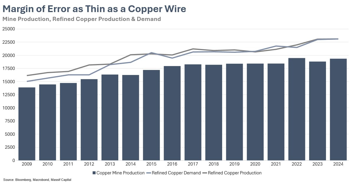 This troubling outlook does not even account for refined copper demand growth projections in line with the last 15 years or some of the more optimistic baseline scenarios based on AI infrastructure buildout or accelerations of the energy transition. High-demand scenarios can require annual new capacity additions of more than 1 million tonnes per annum, far exceeding current approval rates. The potential for demand growth to exceed these projections creates additional upside risk to supply-demand imbalances.