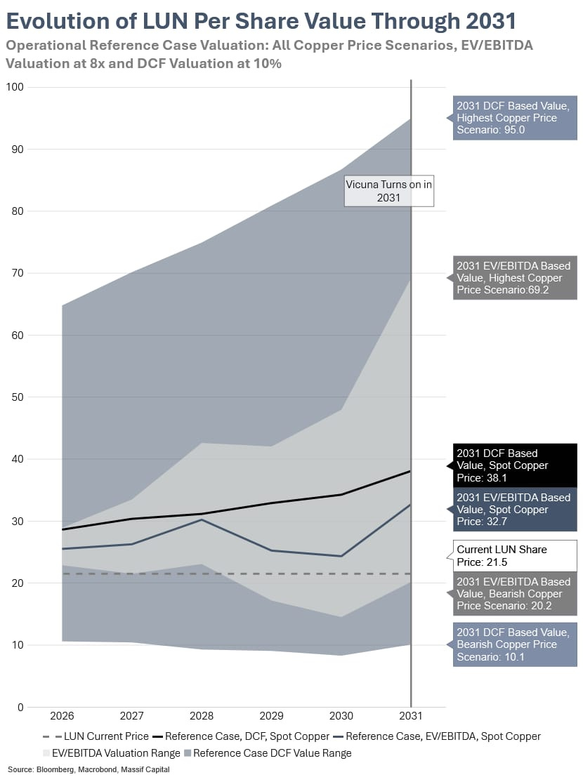 As we demonstrate below, by 2031 LUN should be worth somewhere between CAD $38 (80.7% return from the current price) and CAD $53 (151% return from the current price) and by 2035 some where between CAD $55 and CAD $73 in 2035. These valuations imply the firm will compound shareholder value at a rate of north of 14% per annum for the next decade, a rare but hardly unheard of accomplishment. These ranges are broad due to the uncertainty implicit in the multifaceted growth plan ahead of LUN, and the relatively wide spread of copper scenarios. The range breadth will narrow with time as 2031 and 2035 approach, and path dependency results in various value accretive and/or value dilutive events either occurring or not.