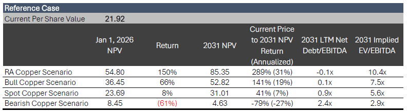 In our reference case, non-Vicuna district growth projects proceed on time and on budget, with Vicuna starting up in 2031. This reference case assumes that the high end of production forecasts is not achieved, but that non-Vicuna growth projects achieve a production target roughly in the middle of the production expectation range. In this case, applied to our copper price scenarios, we value the company as follows: