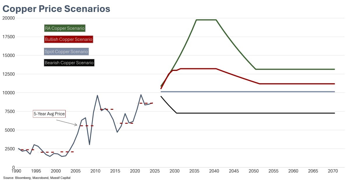 The RA Copper Price Scenario effectively illustrates how to approach this, as extremes often do. If, over the next five years, copper rises to or above $6.00/lb ($13,221/tonne), some market participants will forecast it reaching $9.00/lb ($19,836/tonne). What might seem outlandish at $4.50 will seem aggressive but possible at $6.00, much like $4,500 gold would have seemed absurd in 2023, but eminently feasible today. If copper advances further, the drumbeat for $9.00/lb ($19,766/tonne) will increase. The sentiment and momentum will take over, animal spirits will rise, and the vision of the company’s value in such a scenario will begin to take hold in the minds of investors and punters alike. As thoughtful investors who have run scenarios, we will recognize where that enthusiasm, manifesting in the market as trend and momentum, could take the stock even before the fundamentals justify it; as such, we will also know how to manage our position through that volatility.