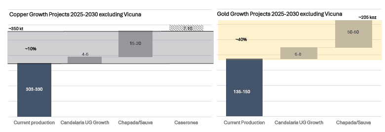 The near-term growth strategy excluding Vicuna involves three different projects: two are part of the Full Potential programs, and one is a brownfield expansion of Chapda. Together, these improvements are expected to produce an additional 30,000-40,000 tonnes of copper and 60,000-70,000 ounces of gold.